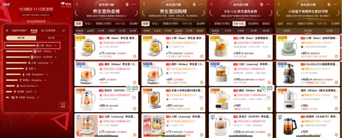 养生热潮之下,如何做出品质之选?小熊电器养生壶的持续热销或许就是答案。数据显示,截至11月6日14:30,在京东平台,京东竞速榜显示小熊电器一举拿下双11家电品牌销售榜养生壶品类第一;京东排行榜养生壶热卖榜第一、养生壶回购榜第一、0.8-1.2L养生壶热卖榜第一、小容量不锈钢养生壶好评榜第一。